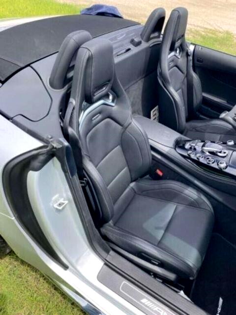 Silver 2018 Mercedes-Benz AMG® GT C RWD 7-Speed Automatic 4.0L V8 AMG® GT C, 2D Convertible, 4.0L V8, 7-Speed Automatic, RWD, Silver, Black Leather, 10 Speakers, 4-Wheel Disc Brakes, ABS brakes, Adaptive suspension, Air Conditioning, AM/FM radio: SiriusXM, AMG® Exterior Carbon Fiber Package, Auto High-beam Headlights, Auto tilt-away steering wheel, Auto-dimming door mirrors, Auto-dimming Rear-View mirror, Automatic temperature control, Brake assist, Bumpers: body-color, CD player, Convertible roof lining, Convertible roof wind blocker, Delay-off headlights, Driver door bin, Driver vanity mirror, Dual front impact airbags, Dual front side impact airbags, DVD-Audio, Electronic Stability Control, Emergency communication system: mbrace, Exclusive Nappa Leather Upholstery, Exterior Parking Camera Rear, Four wheel independent suspension, Front anti-roll bar, Front Bucket Seats, Front Center Armrest, Front dual zone A/C, Front reading lights, Fully automatic headlights, Garage door transmitter, Heated & Ventilated Front Seats w/Memory, Heated front seats, Illuminated entry, Integrated roll-over protection, Knee airbag, Low tire pressure warning, Memory seat, Navigation system: COMAND®, Occupant sensing airbag, Outside temperature display, Overhead airbag, Overhead console, Panic alarm, Passenger vanity mirror, Power convertible roof, Power door mirrors, Power driver seat, Power passenger seat, Power steering, Power windows, Premium audio system: COMAND®, Radio data system, Radio: Burmester® Surround Sound System, Rain sensing wipers, Rear anti-roll bar, Rear fog lights, Rear window defroster, Remote keyless entry, Security system, Speed control, Speed-sensing steering, Spoiler, Sport steering wheel, Steering wheel memory, Steering wheel mounted audio controls, Tachometer, Telescoping steering wheel, Tilt steering wheel, Traction control, Trip computer, Turn signal indicator mirrors, Variably intermittent wipers, Ventilated front seats, Weather band radio.